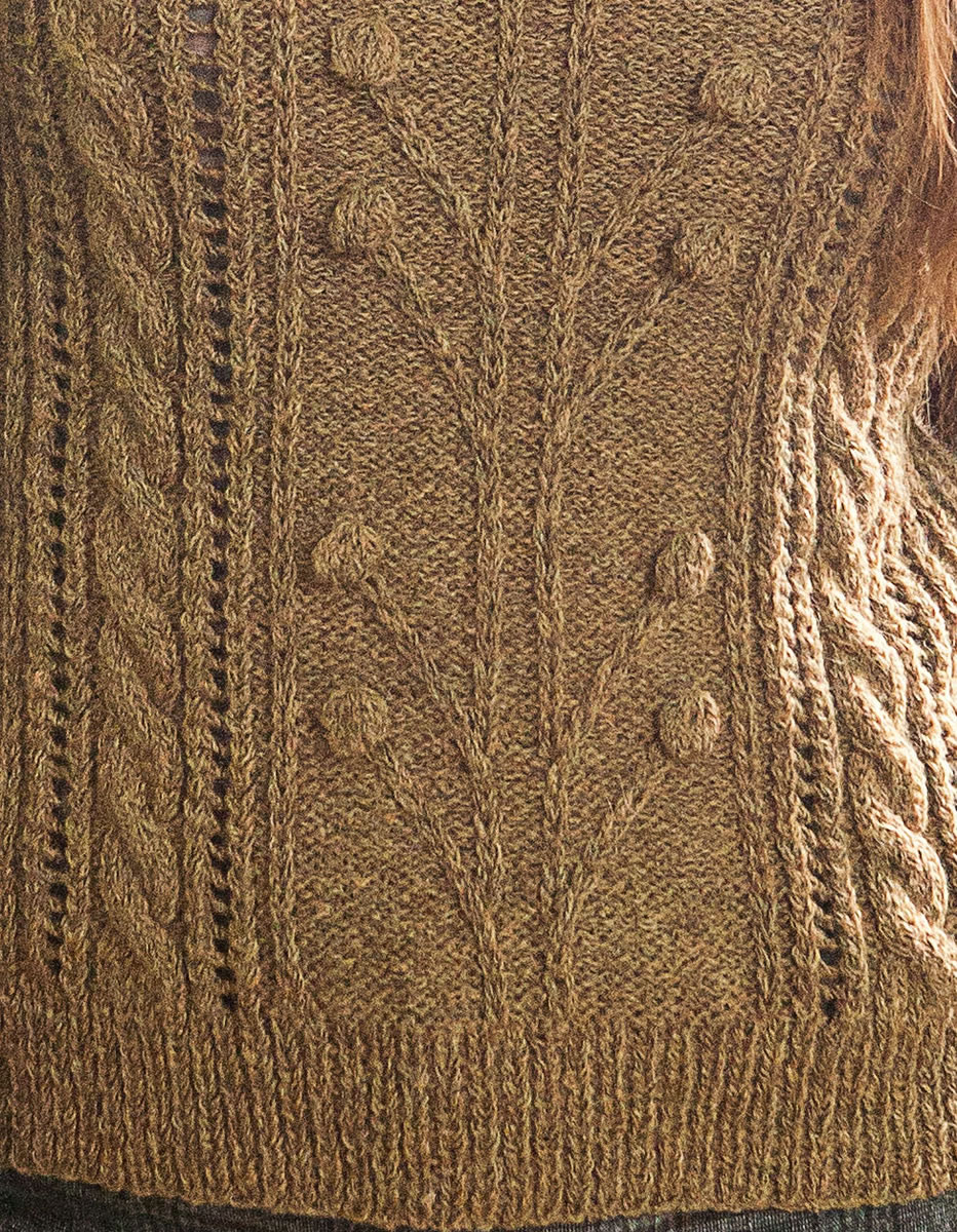 Lana Grossa Alta Moda Alpaca (90 % Alpaka, 5 % Schurwolle, 5 % Polyamid, Lauflänge 140 m/50 g) 450 (500- 550) g Goldbraun meliert (Fb 50); Stricknadeln Nr. 5 und 6, eine 40 cm lange Rundstricknadel Nr. 5,5.