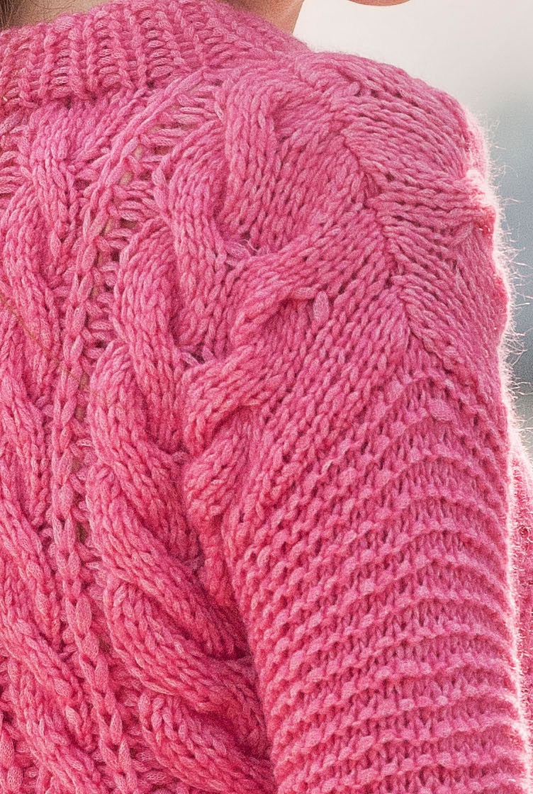 Auch zu dunklen Farben ein Knaller: der pinkfarbene Pulli mit Zopf- Mustern und dekorativem, doppelt gearbeiteten Halsausschnitt