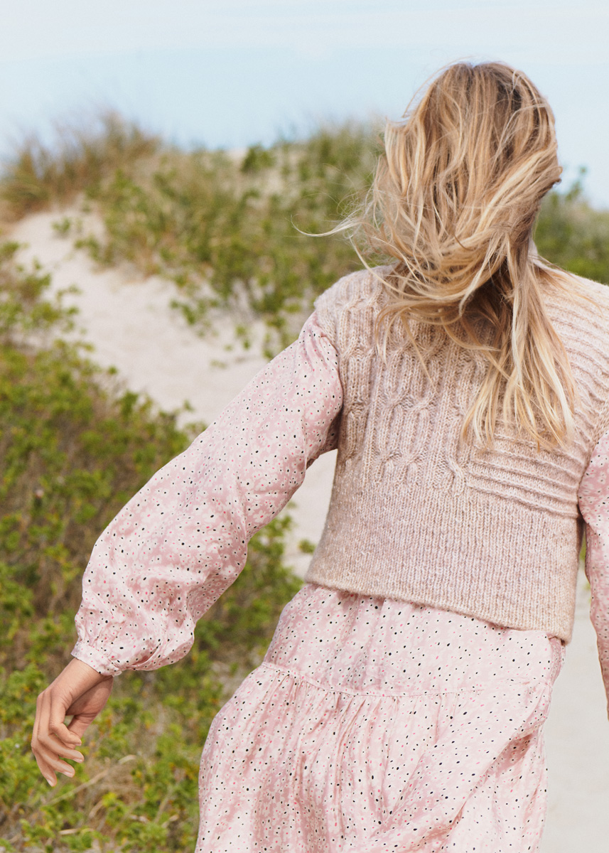 Dieser lebhaft melierte Pullunder besteht aus einem weichen, unkomplizierten Schlauchgarn. Dazu gibt es einen Strukturmustermix und Ärmelblenden aus Hebemaschen. Für elastische Ränder wird italienisch angeschlagen und abgekettet.