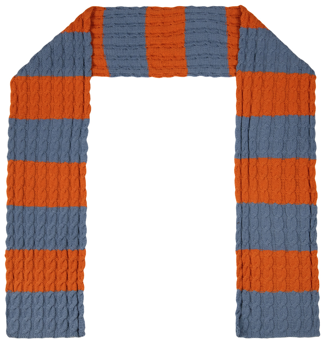 Lana Grossa „Cool Wool“ (100% Schurwolle (Merino extrafine), Lauflänge ca. 160 m/50 g), je 150 g in Graublau (Fb 2037) und Orangerot (Fb 2066); Stricknadeln Nr. 3,5.