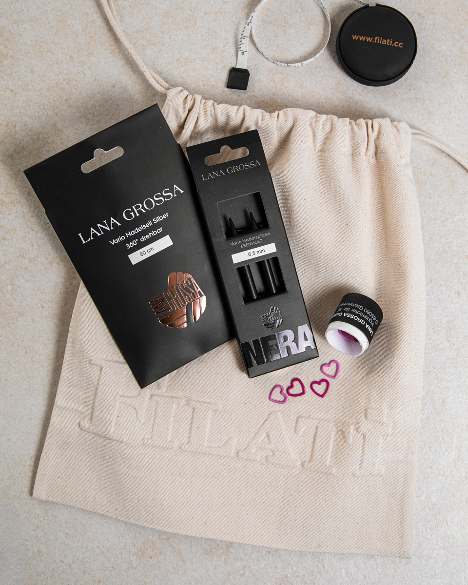 Wolle, Nadeln und Zubehör finden darin mühelos ihren Platz – ob unterwegs, im Café oder auf Reisen. Der praktische Kordelzug hält alles sicher zusammen, damit du jederzeit bereit bist: einfach greifen, aufziehen und losstricken.